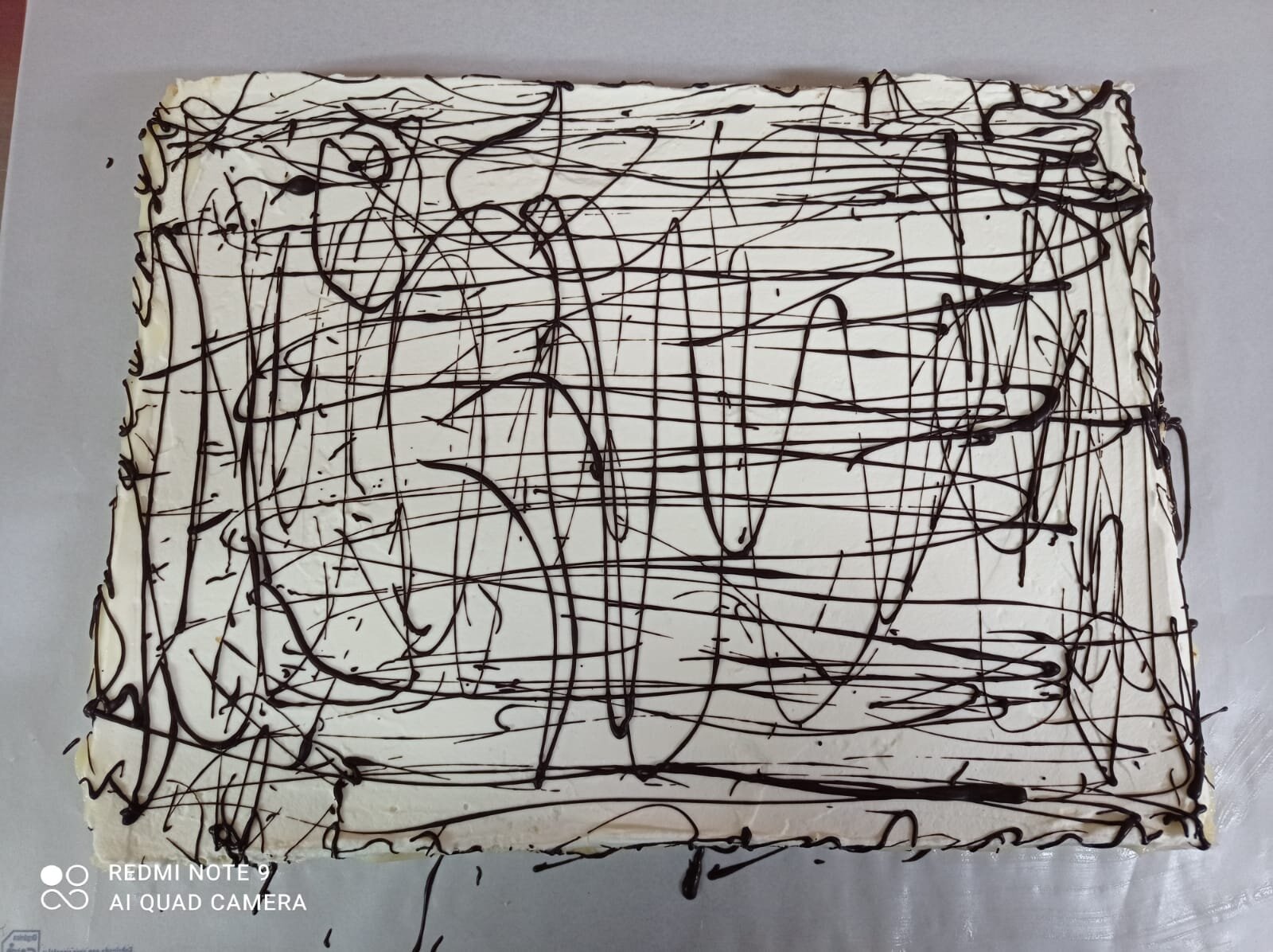 Bizcocho relleno de crema de cafe, pintado de chocolate blanco con cafe